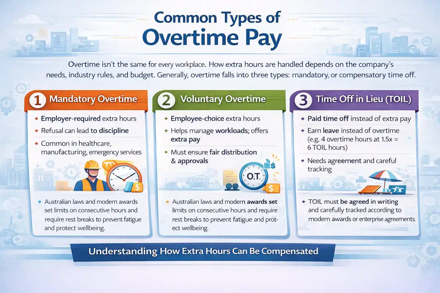 In Australia, overtime is regulated by modern awards, enterprise agreements, and the Fair Work Act. These rules set weekly and daily hour thresholds, standard multipliers, and higher rates for weekends and public holidays. They ensure employees are fairly paid for extra or unsociable hours. Understanding them helps employers and staff maintain a compliant and fair workplace.