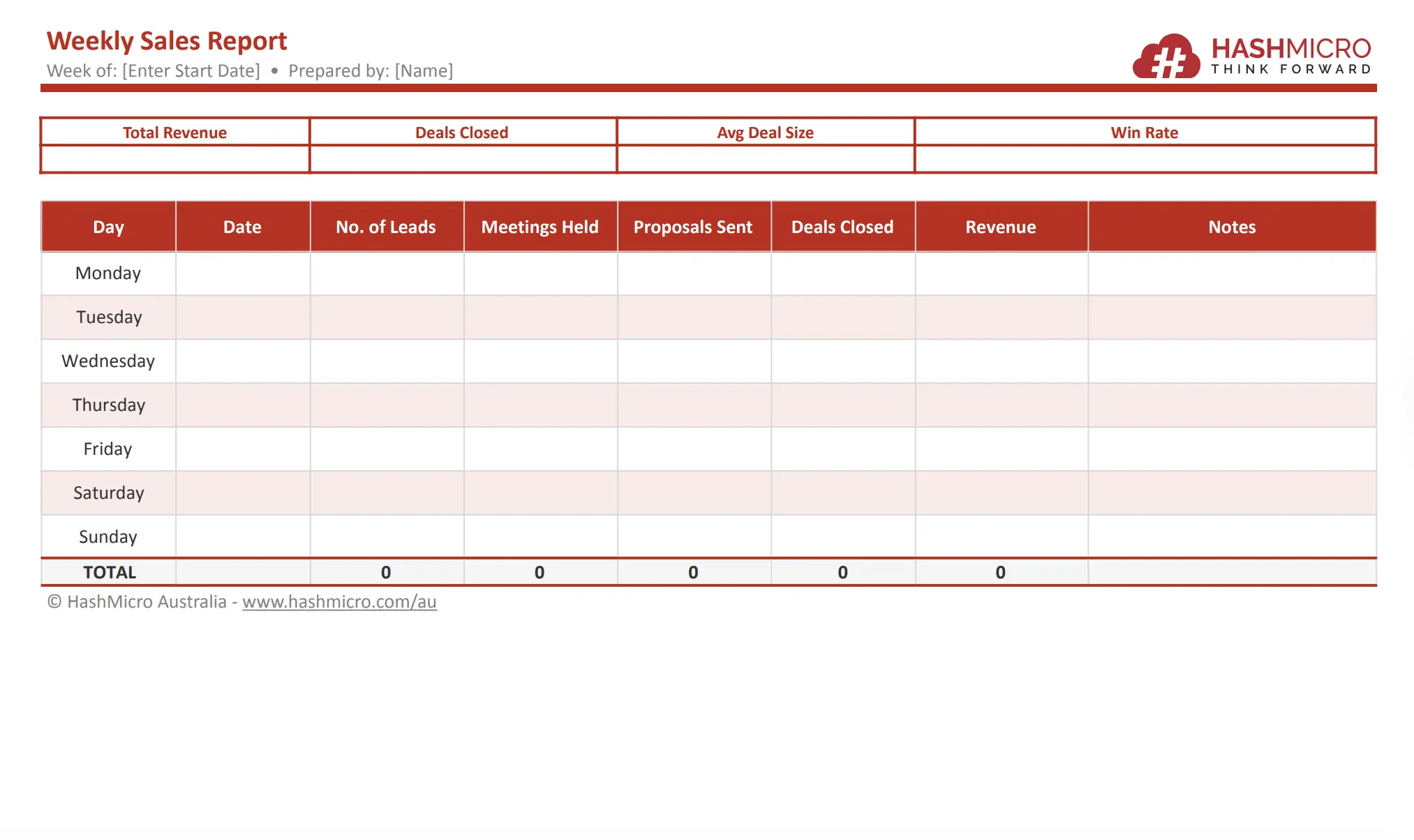 This template summarises weekly sales performance and pipeline movement. It is commonly used during team review meetings to assess progress and priorities.