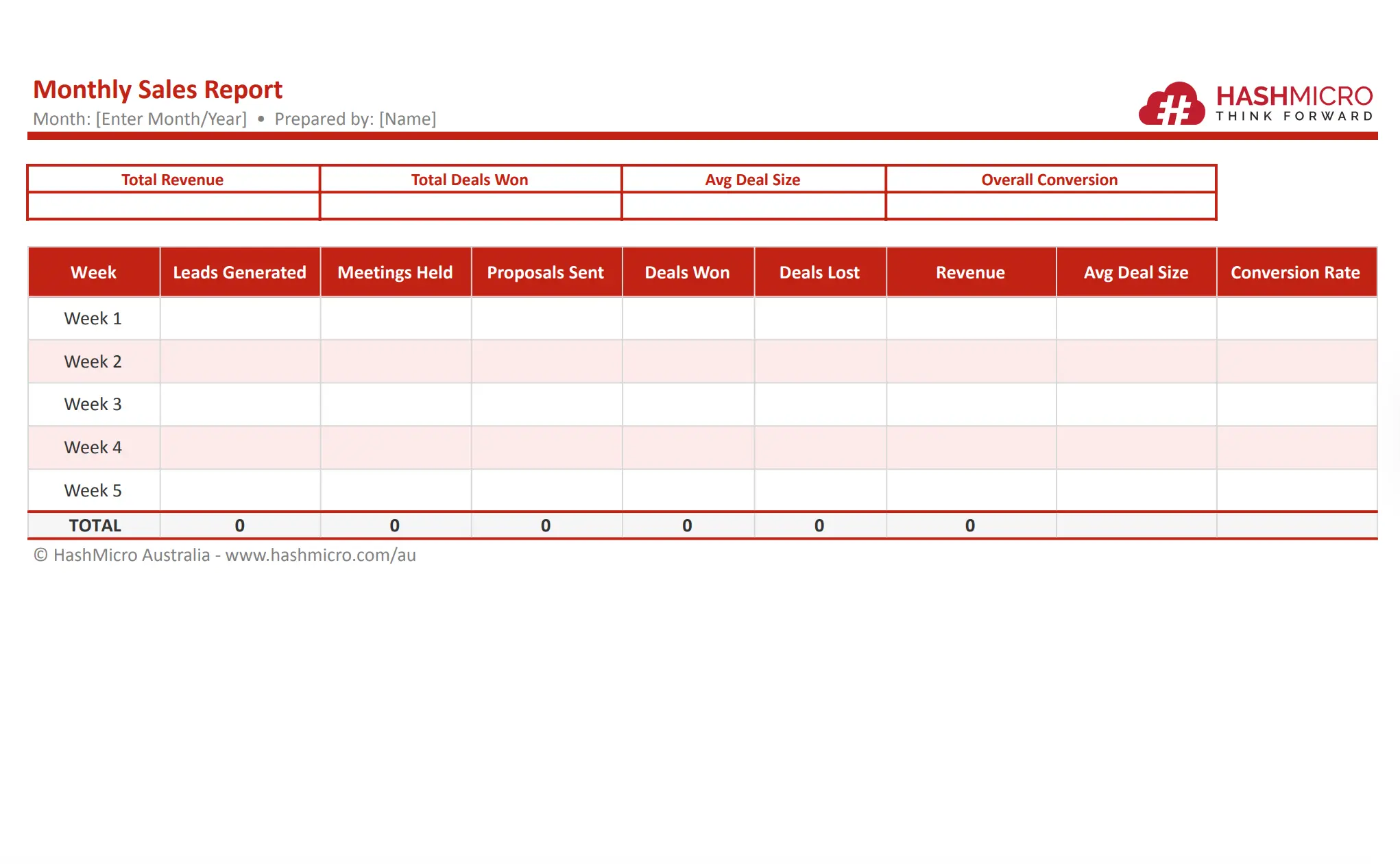 A monthly template gives management a broader view of revenue, sales trends, and team performance. It is useful for commissions, budgeting, and monthly reviews.