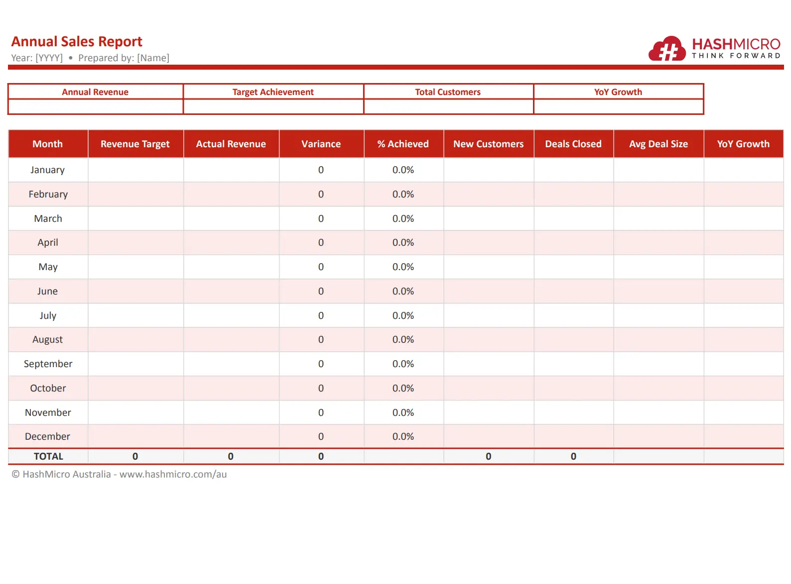 Use an annual template to summarise full-year sales results and prepare for future planning. It is especially useful during EOFY reviews.