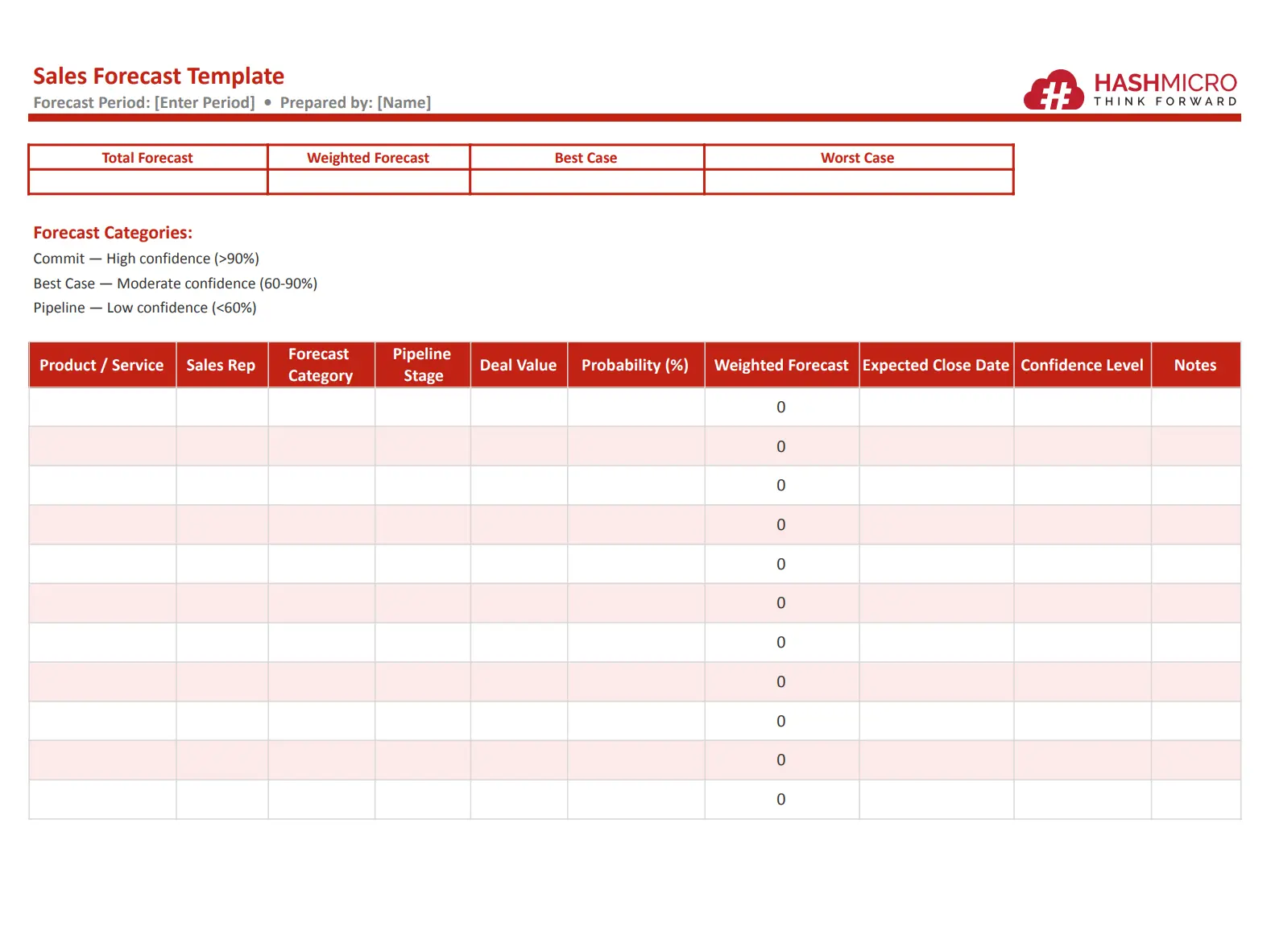 A sales forecast template estimates future revenue using historical data and current pipeline opportunities. It helps businesses plan budgets and resources.