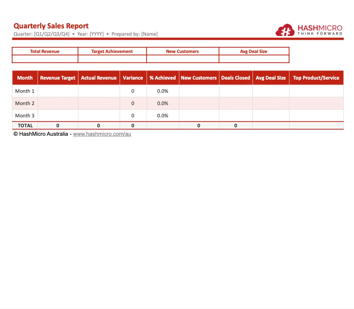 This template reviews performance over three months and is useful for strategic planning. Australian businesses often align quarterly reports with BAS reporting periods.