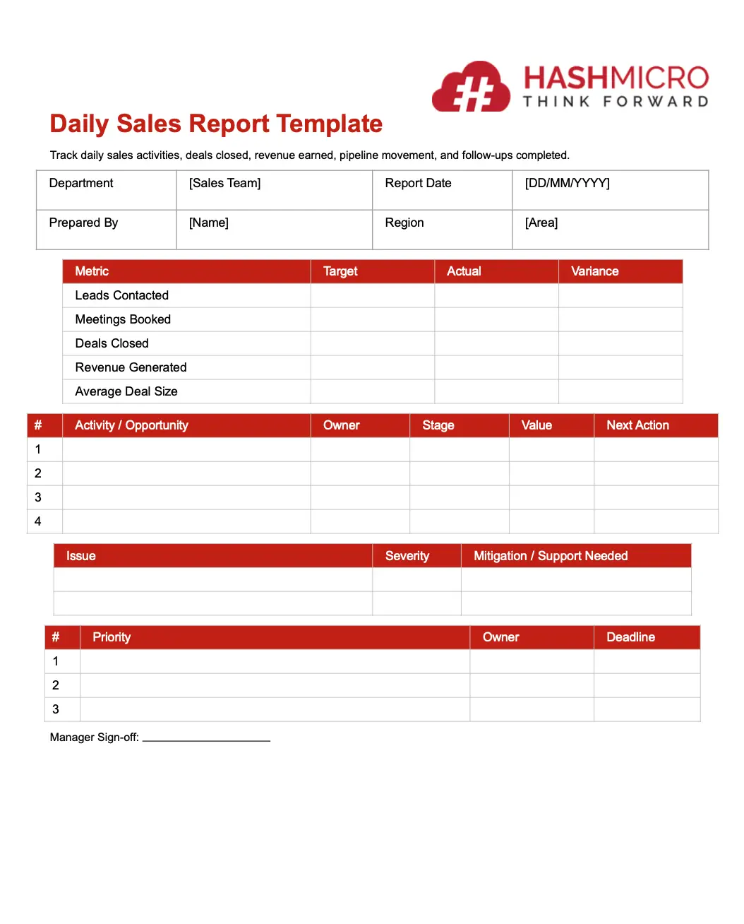 Using a ready-made template can save time and make sales reporting more consistent. The templates below cover common reporting needs, from daily activity tracking to long-term forecasting, and can be customised for different business sizes or industries.