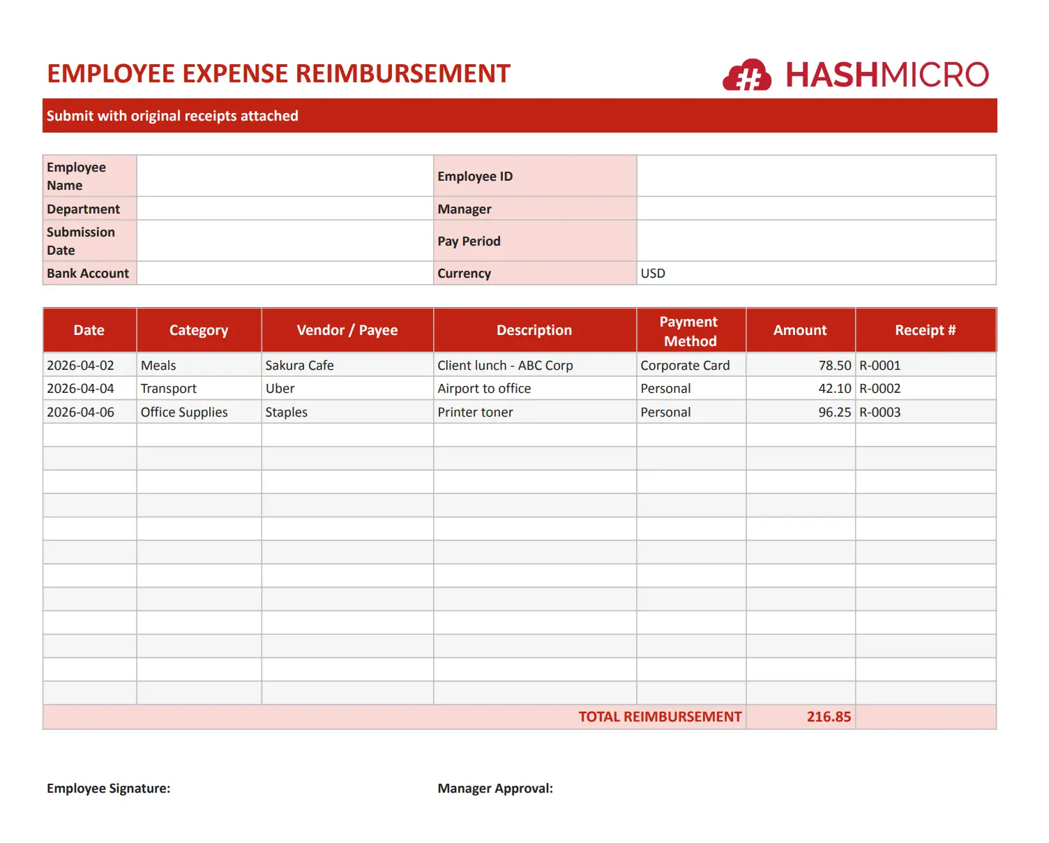 Every claim should include receipts or invoices as proof of purchase. These documents help verify the amount, supplier details, and business expense validity.