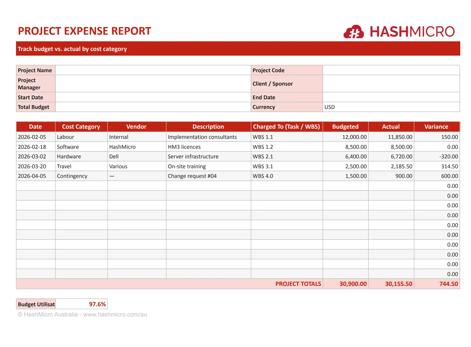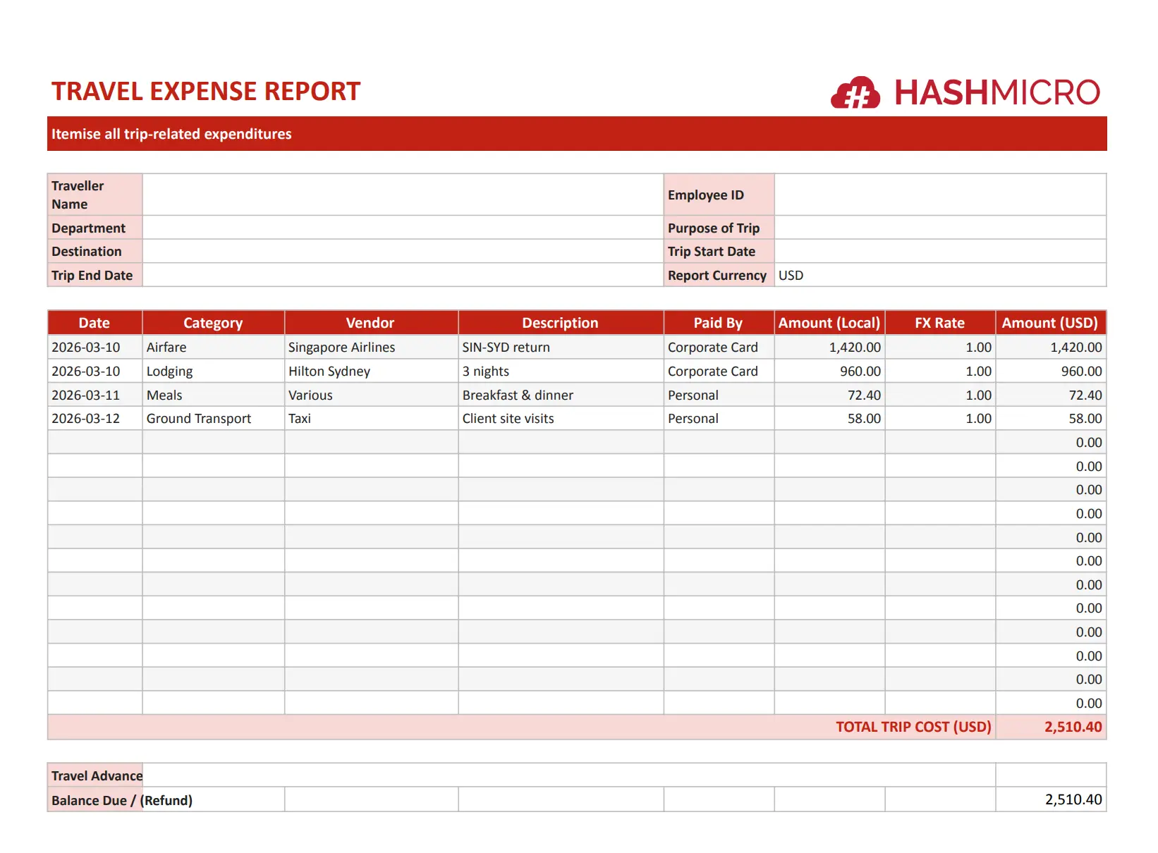 Every expense report should include the employee’s name, ID, department, and contact details. It should also show the company name, ABN, and payment details if reimbursement is required.