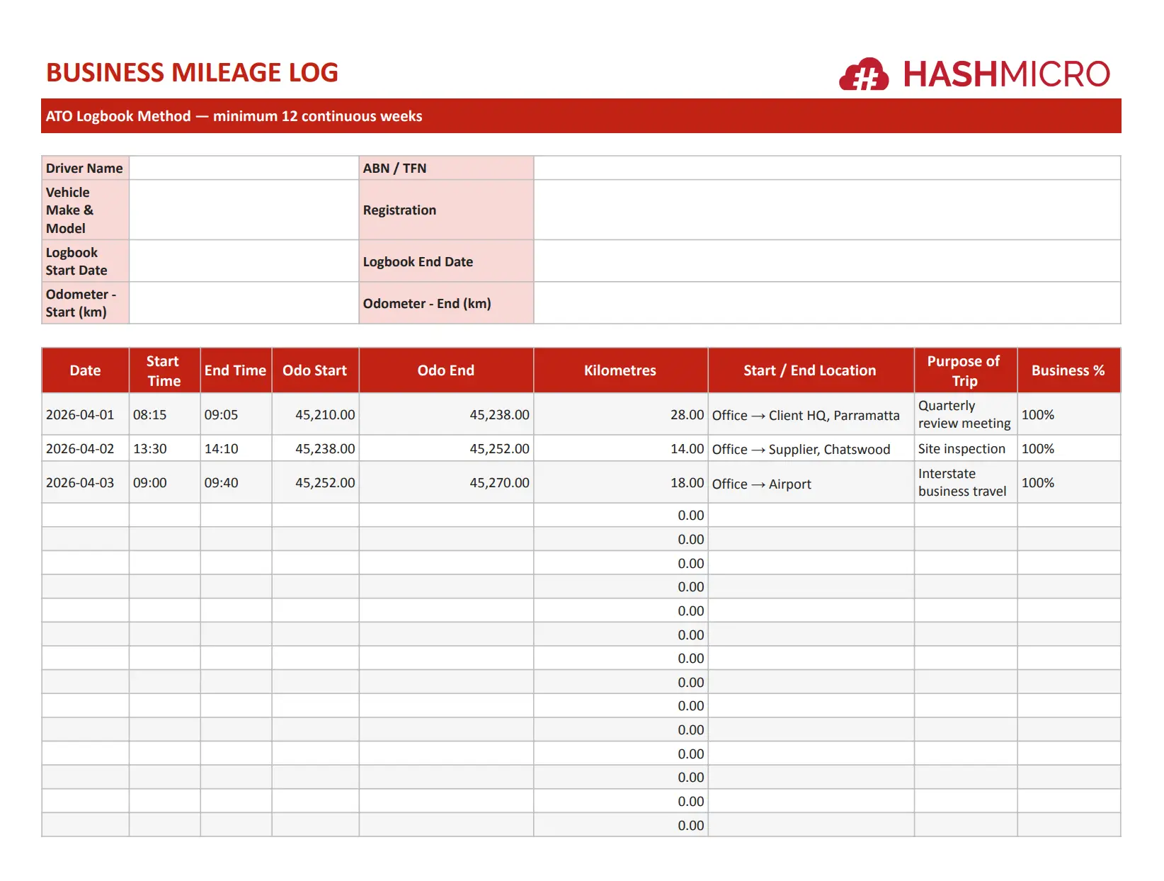 This logbook layout ensures you capture the exact data required by the ATO to substantiate motor vehicle claims.