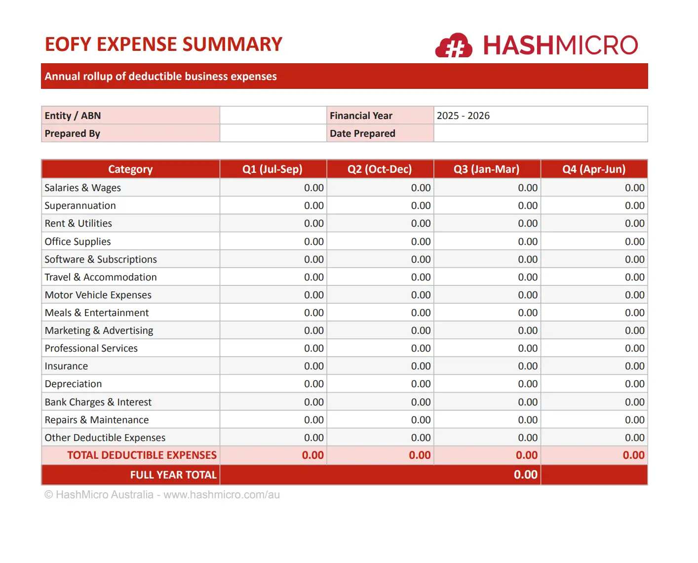 The EOFY expense summary template summarises all yearly expenses for tax and financial reporting.