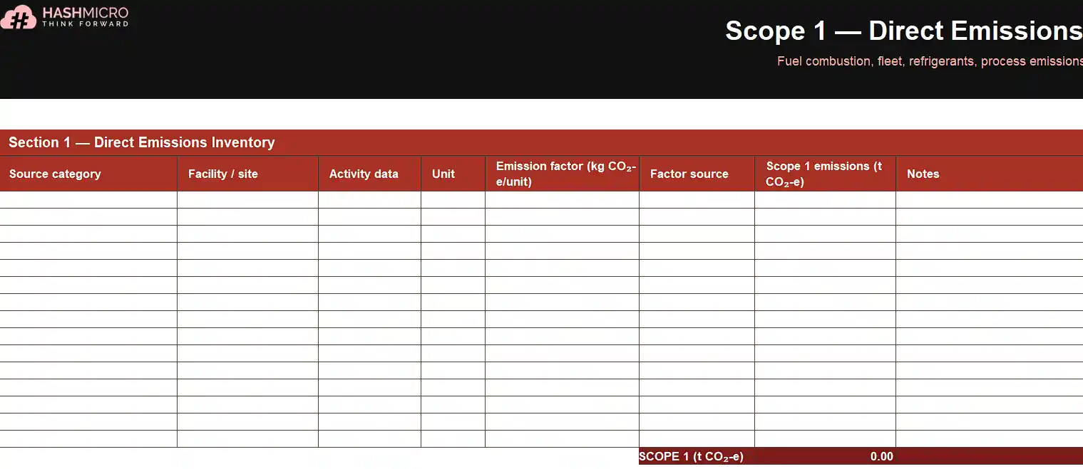 Covers Scope 1, 2, and 3 calculations using the GHG Protocol Corporate Standard. Activity data fields include fuel type, electricity source, refrigerants, business travel, freight, and purchased goods.