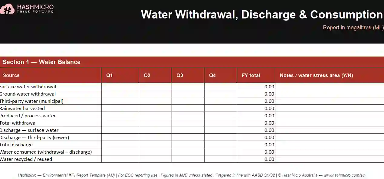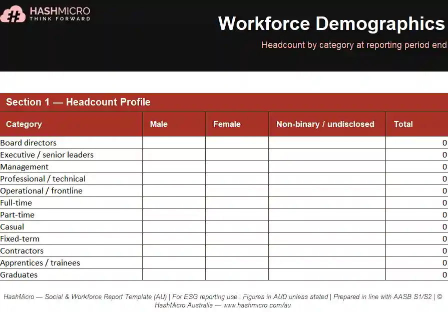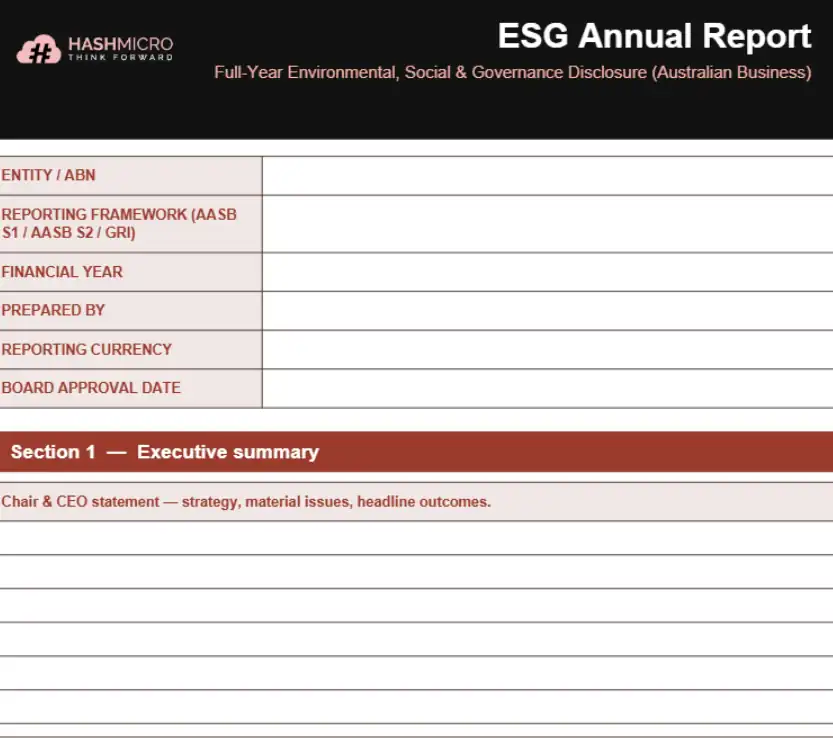 The following eight templates cover the most common ESG reporting formats used by Australian businesses. Each is structured to align with AASB S1, AASB S2, GRI Standards, and Safe Work Australia data requirements.