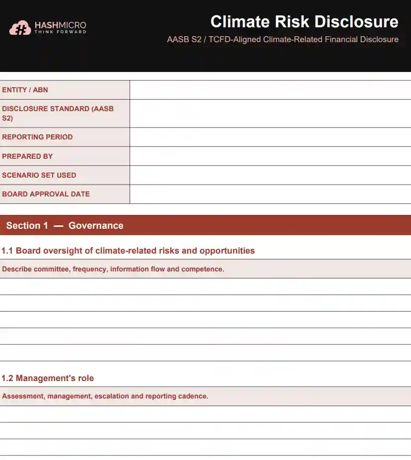 Structured around the four AASB S2 pillars: governance, strategy, risk management, and metrics. It includes pre-formatted sections for scenario analysis, risk registers, and climate-related financial impact.