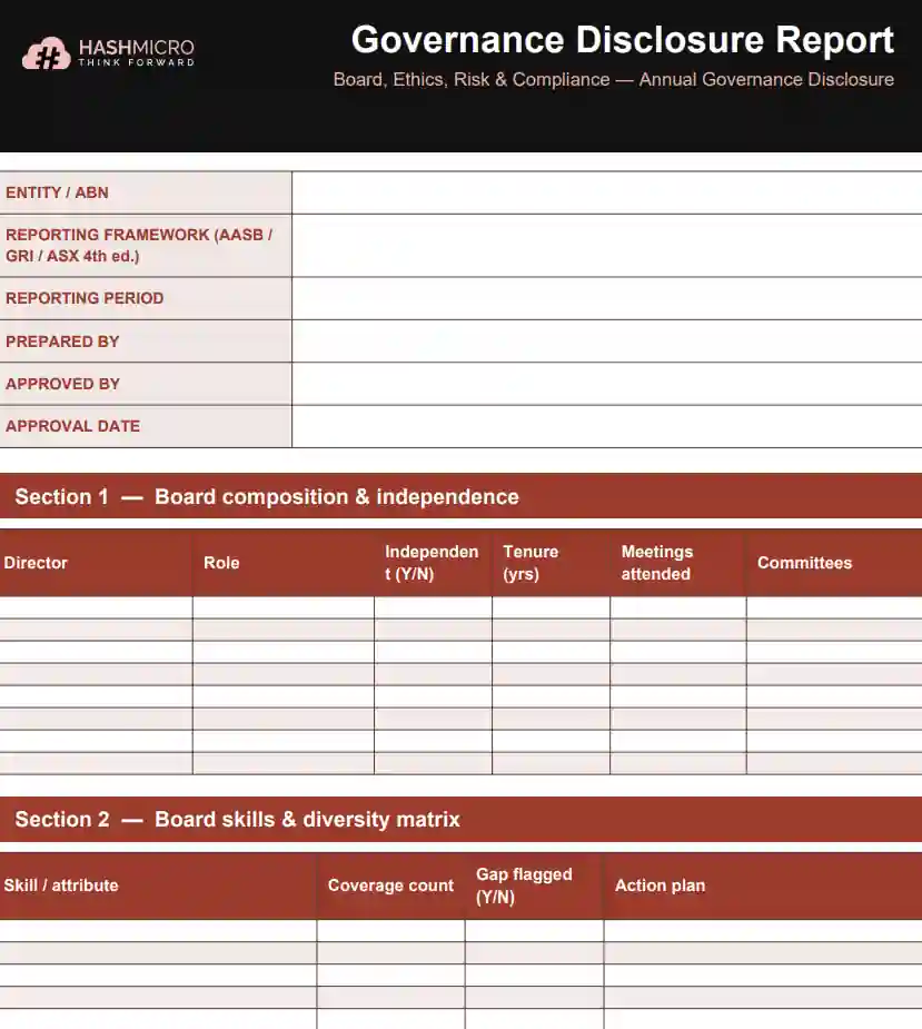 | Governance disclosure report | AASB S1, ASX CGC Principles | Board composition, independence, diversity, committees, executive pay, ethics, and cyber-risk oversight. | Boards, lenders, shareholders |