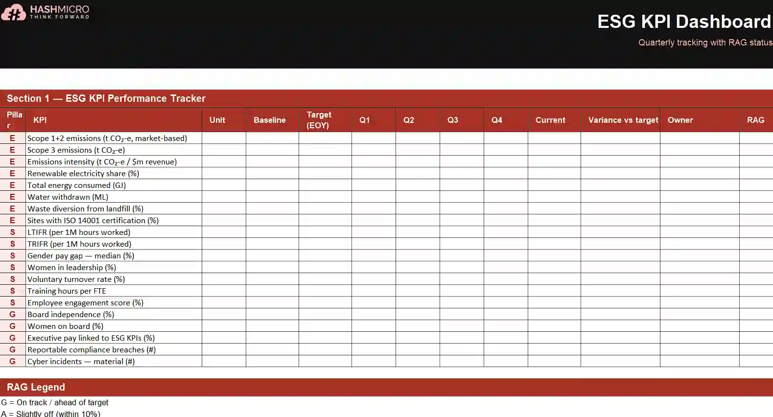 7. ESG KPI dashboard template (quarterly tracking)