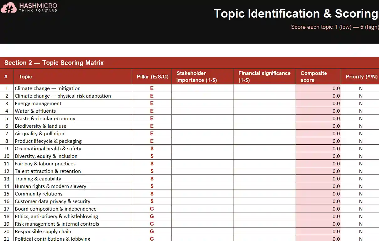 Guides the materiality process from stakeholder identification to final priority shortlist. Includes survey templates, scoring rubrics, and a visual matrix plotting financial impact against stakeholder concern.