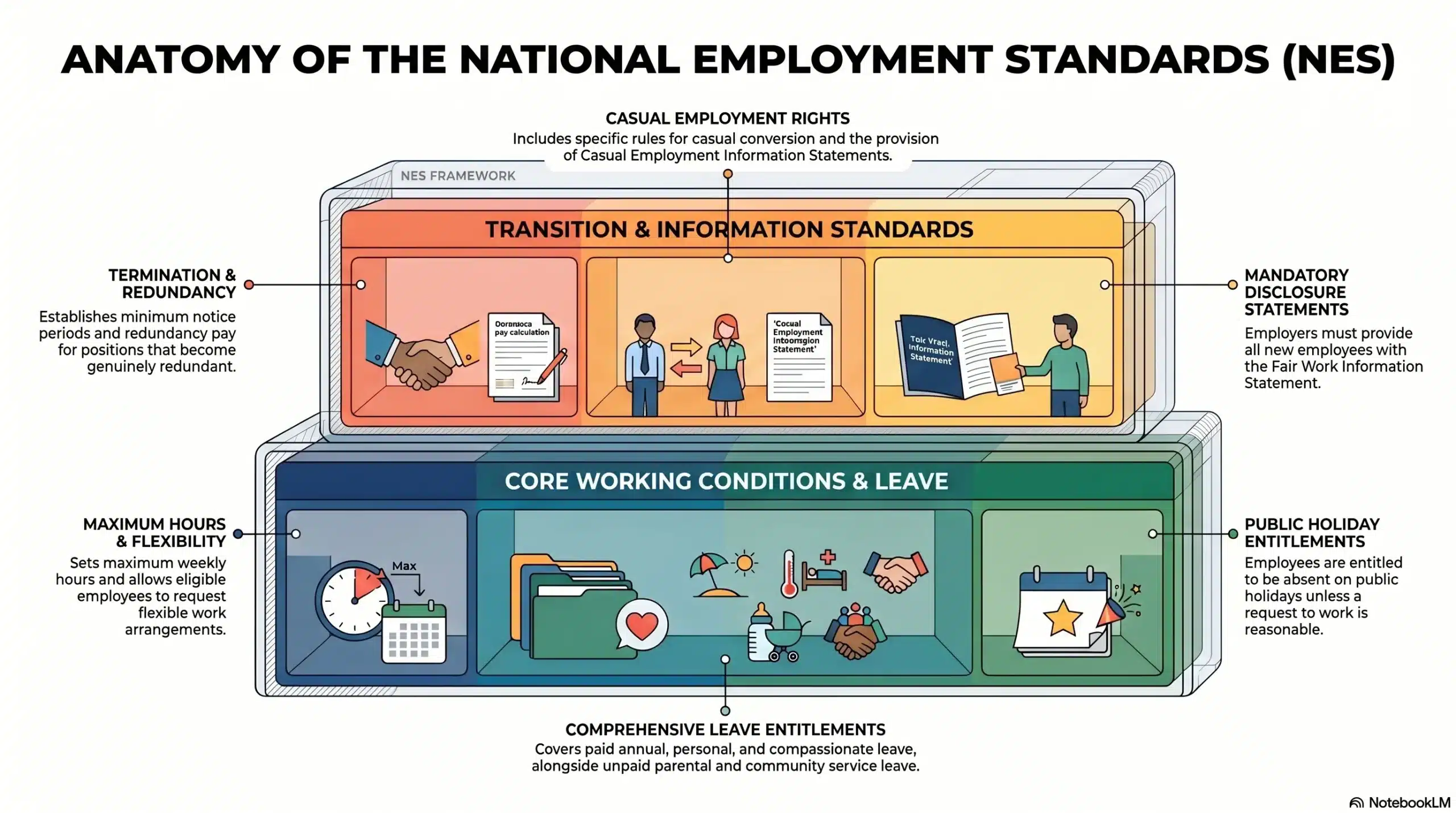 The NES cover a range of minimum employee rights relating to hours of work, leave, termination, redundancy, and workplace information.