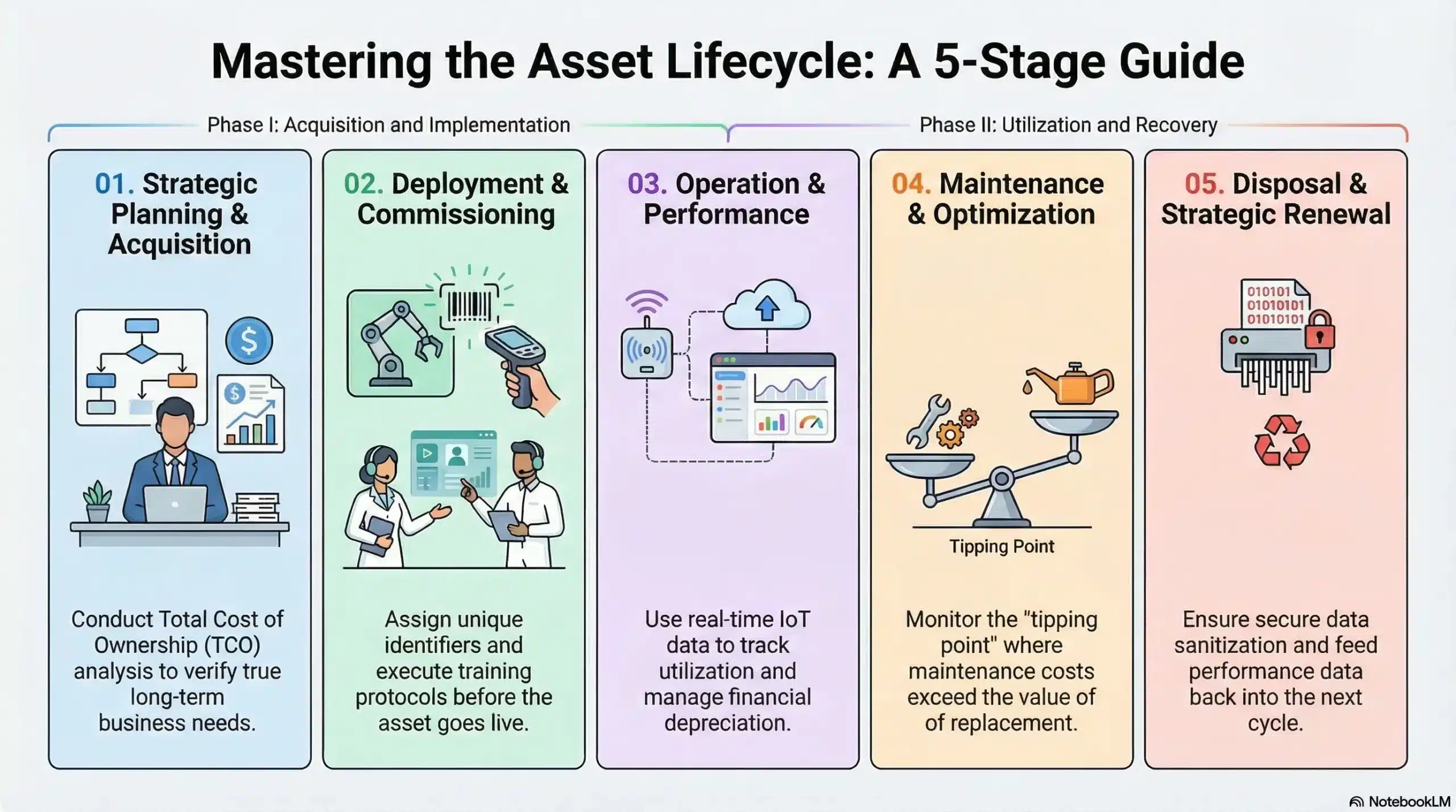 To manage assets effectively, businesses must separate the lifecycle into manageable phases. While variations exist depending on the industry, the generally accepted framework consists of five distinct stages, each representing a critical opportunity to add value or reduce risk.