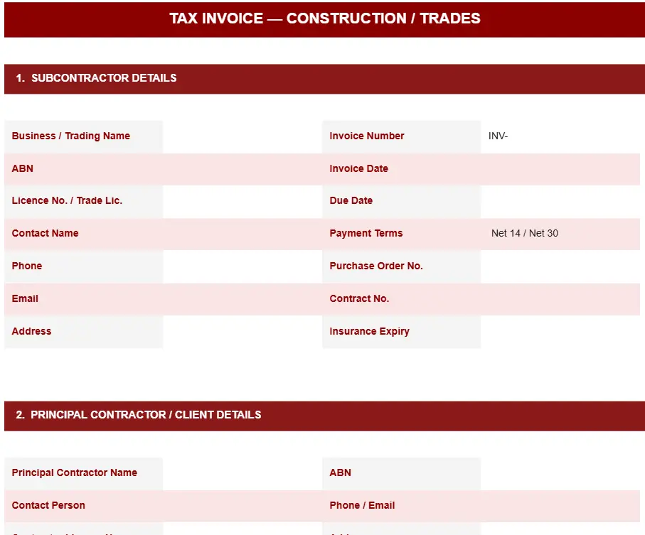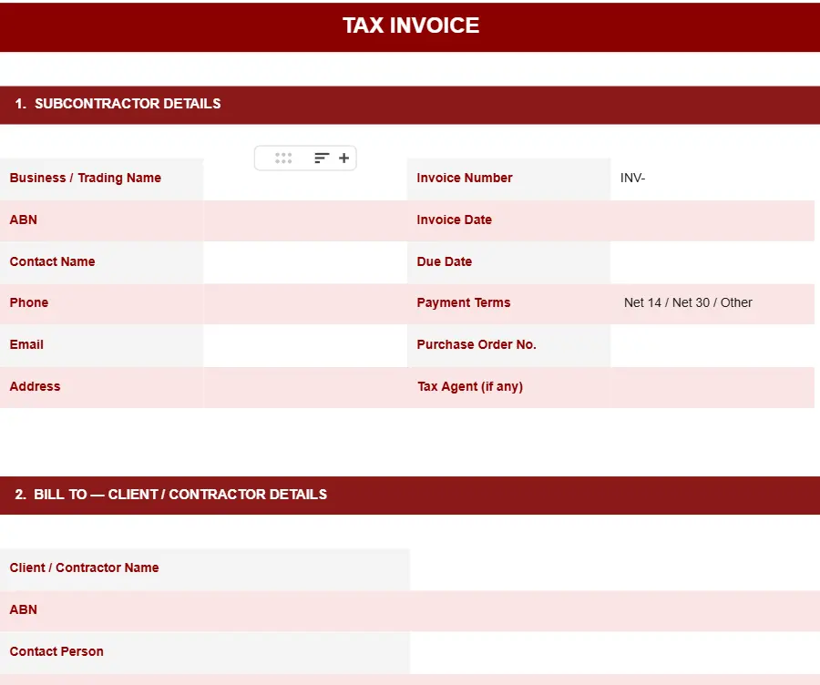 STANDARD SUBCONTRACTOR TAX INVOICE TEMPLATE