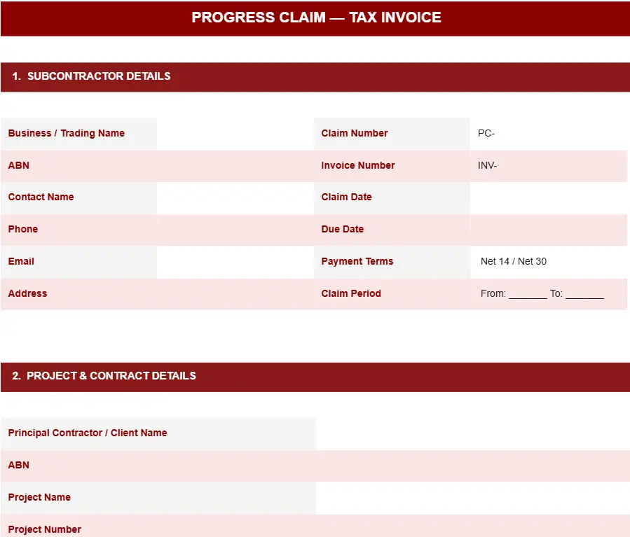Your business identity must be clearly stated on every subcontractor invoice. This includes your registered business name, contact details, and Australian Business Number (ABN).