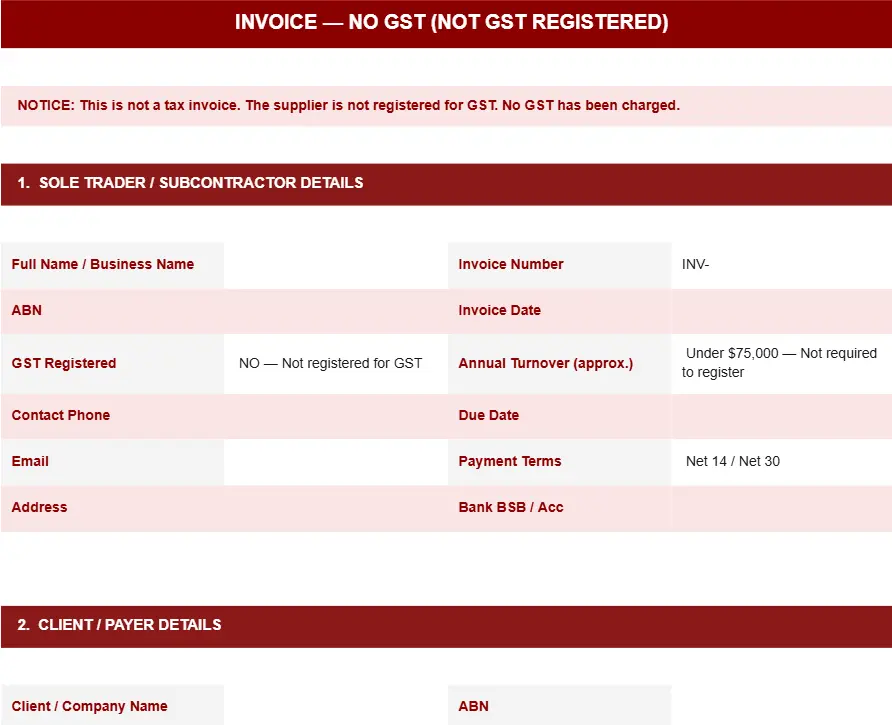 Designed for subcontractors not registered for GST, clearly indicating that no tax is applied.