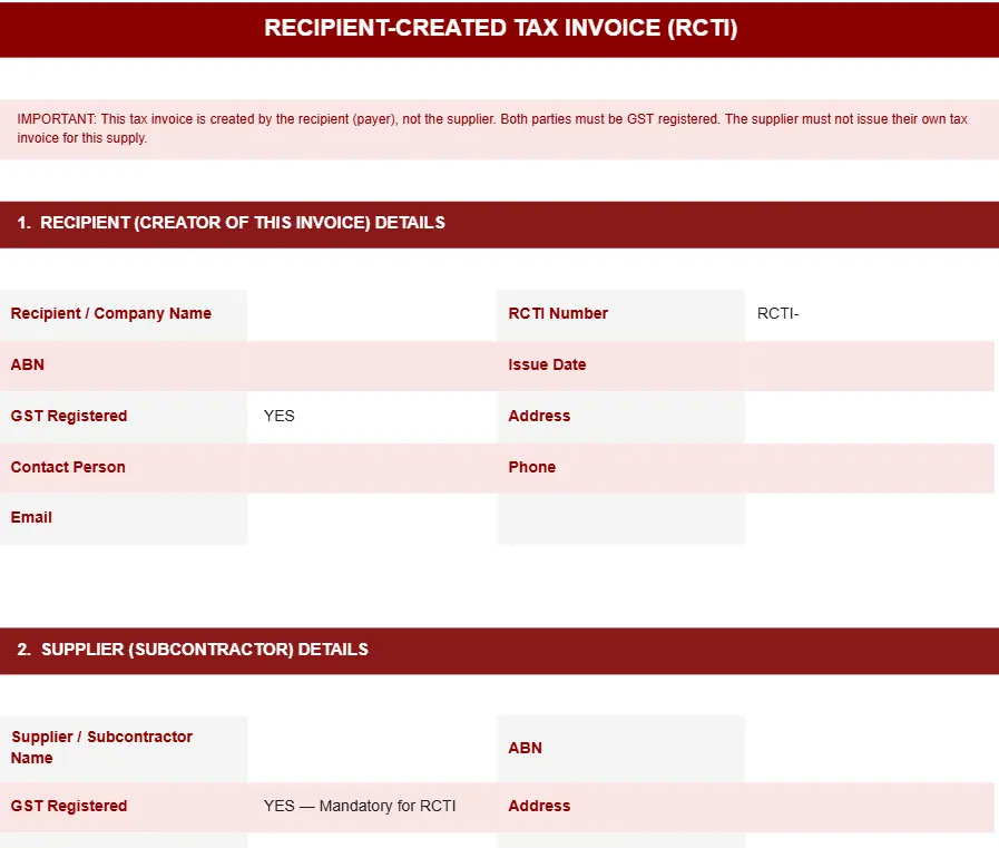 - When recipient-created tax invoices apply: In some cases, the contractor issues the invoice on behalf of the subcontractor. This arrangement is only valid when both parties agree and proper documentation is maintained.