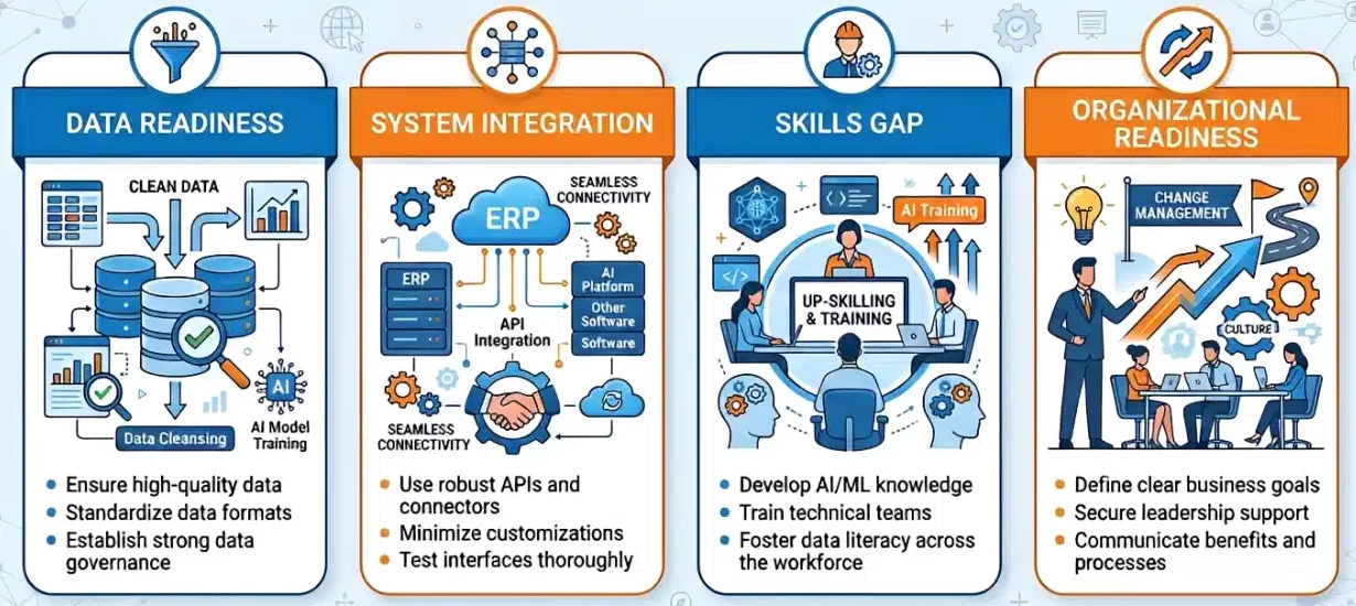 Although AI integration offers significant advantages, implementing it within ERP systems requires careful preparation. Organizations must evaluate both technical and operational factors before deploying AI-driven capabilities.