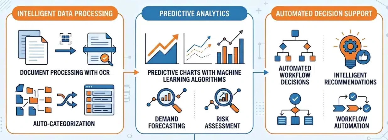 Enterprise data often comes from many sources, including invoices, emails, documents, and operational systems. Intelligent data processing allows AI to extract and structure this information so it can be analyzed within the ERP environment.