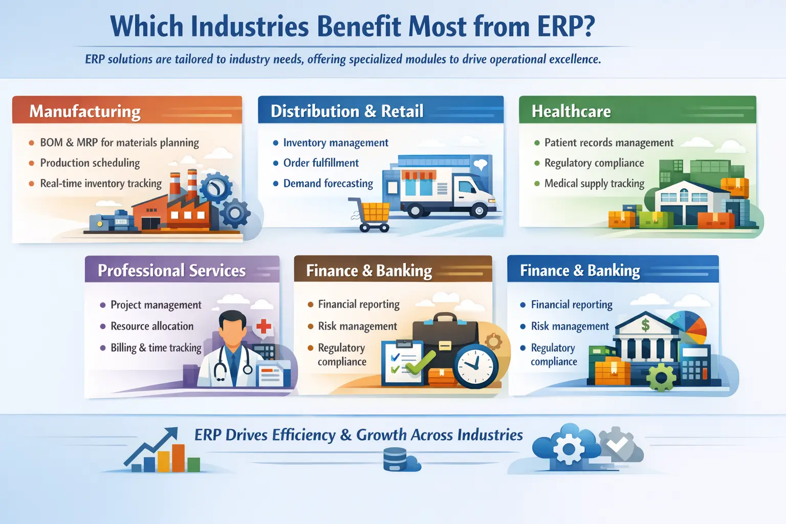 ERP benefits a wide range of industries, including manufacturing, retail, healthcare, professional services, and finance, by streamlining processes and improving efficiency