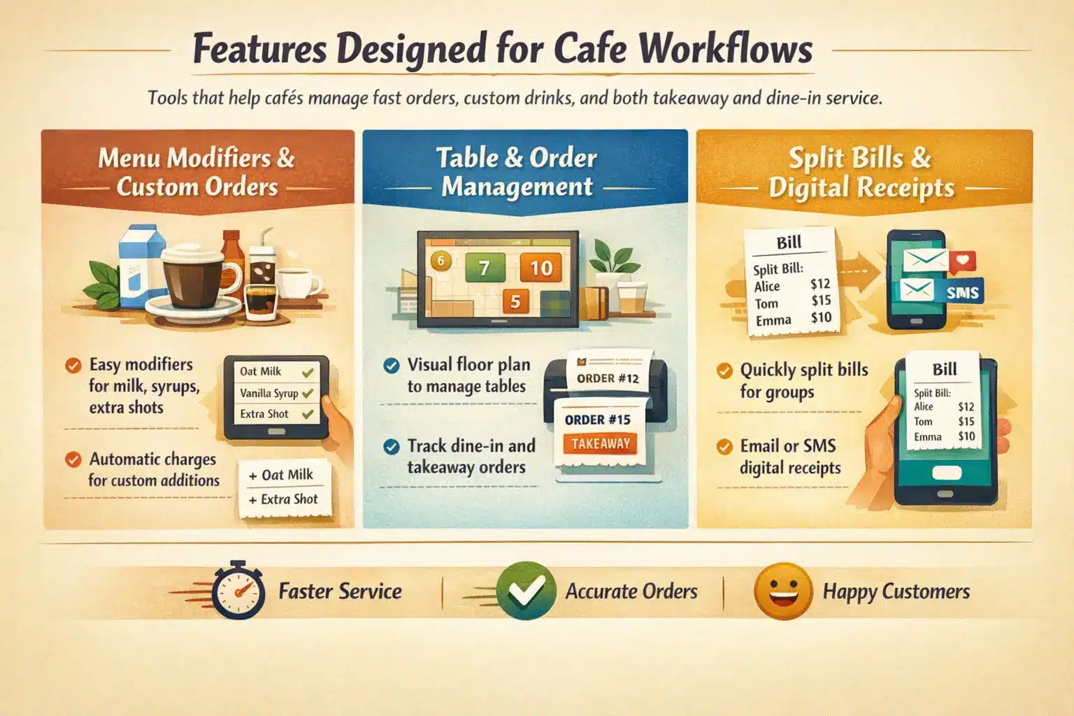 Learn how modifiers, table management, and split billing help cafés manage complex orders smoothly.