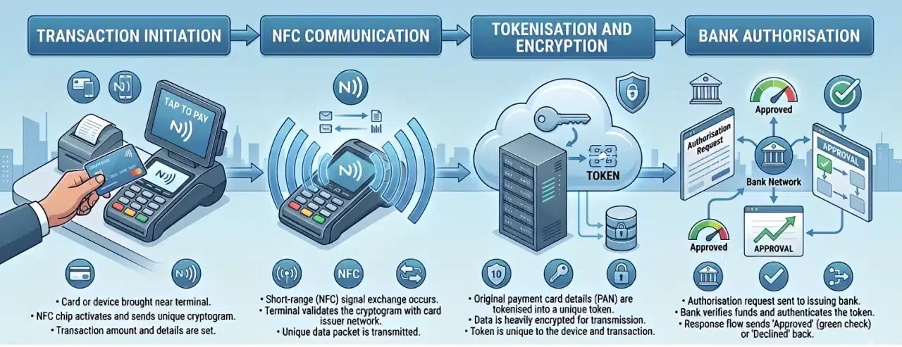 Contactless payments use NFC, tokenisation, and encryption to complete secure transactions within seconds.