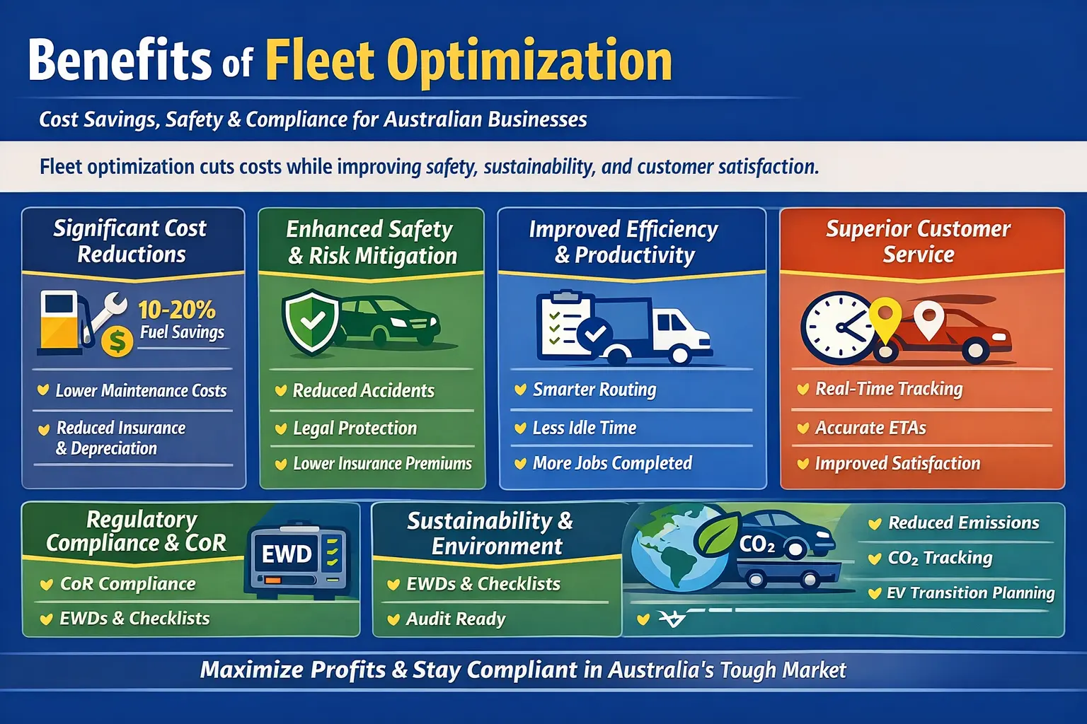 In Australia, optimization also ensures compliance with regulations like the Chain of Responsibility (CoR) and NHVR safety rules. Efficient fleets must balance operational performance, cost control, and legal obligations.