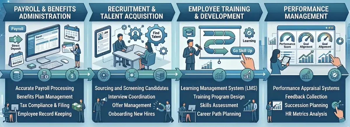 HR outsourcing can cover a wide range of workforce management activities. Many organizations choose to outsource specific HR functions that require specialized expertise or significant administrative effort.