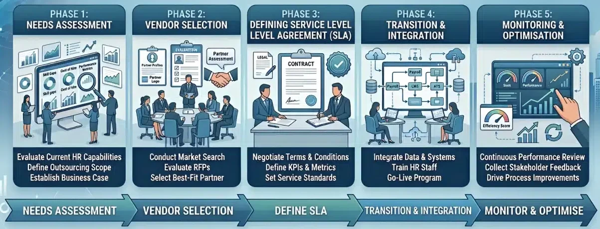 Organizations typically follow a phased approach when introducing HR outsourcing. This allows them to maintain operational stability while gradually transferring responsibilities to the provider.