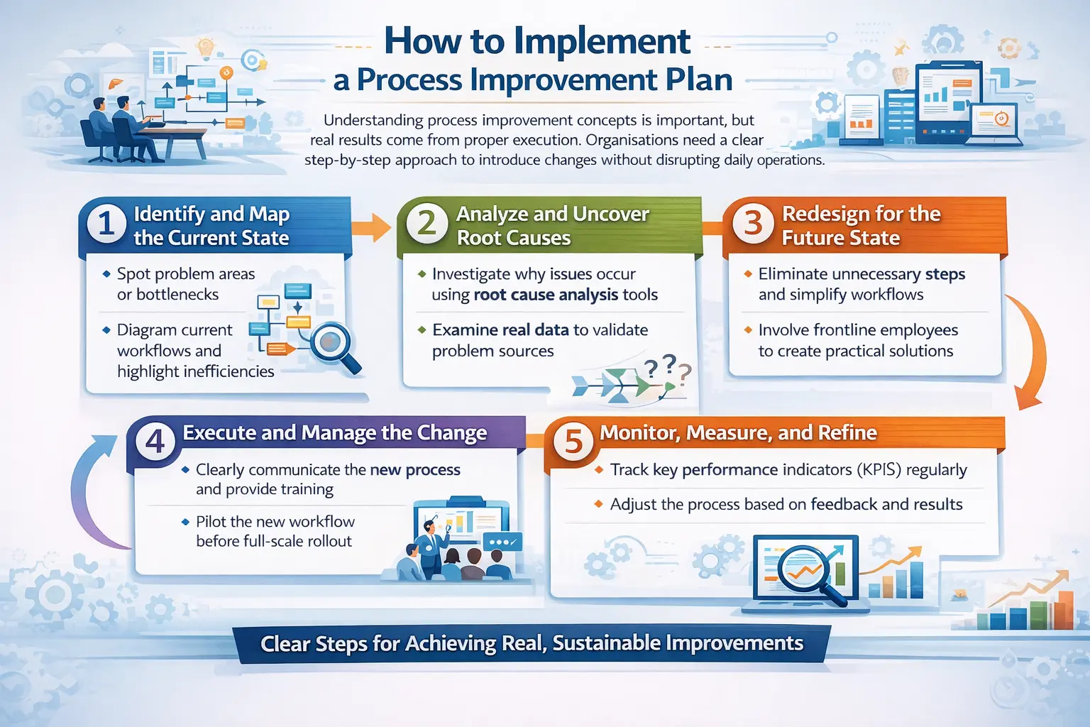 Understanding process improvement concepts is important, but real results come from proper execution. Organisations need a clear step-by-step approach to introduce changes without disrupting daily operations.