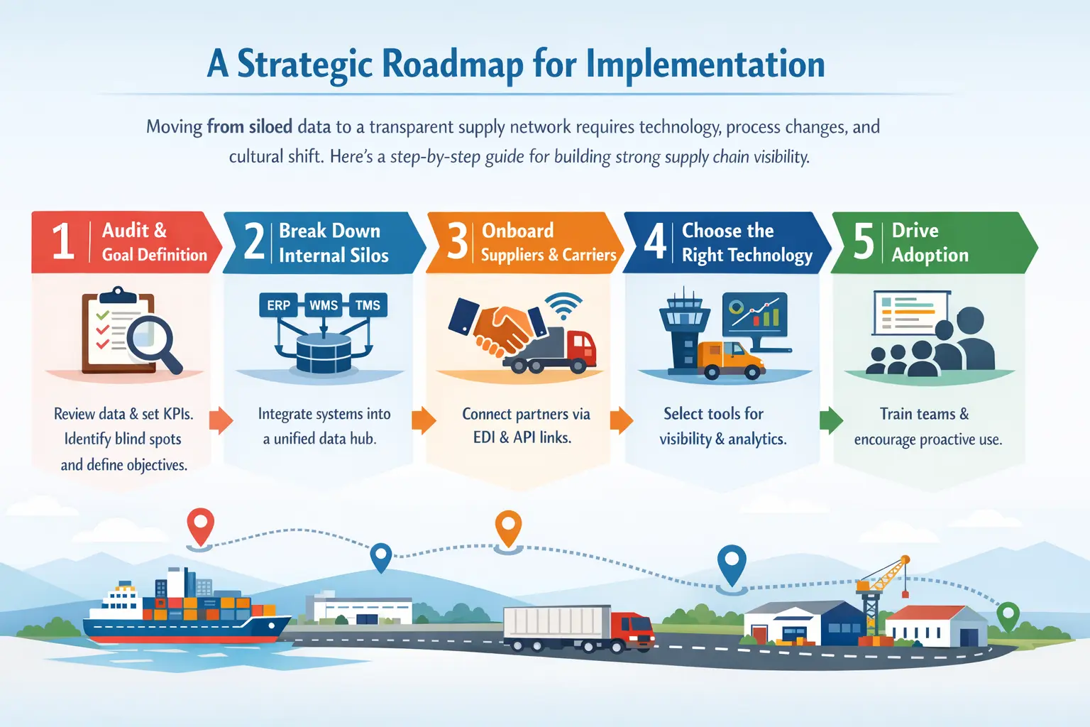 Moving from siloed data to a transparent supply network requires technology, process changes, and cultural shift. Here’s a step-by-step guide for building strong supply chain visibility.