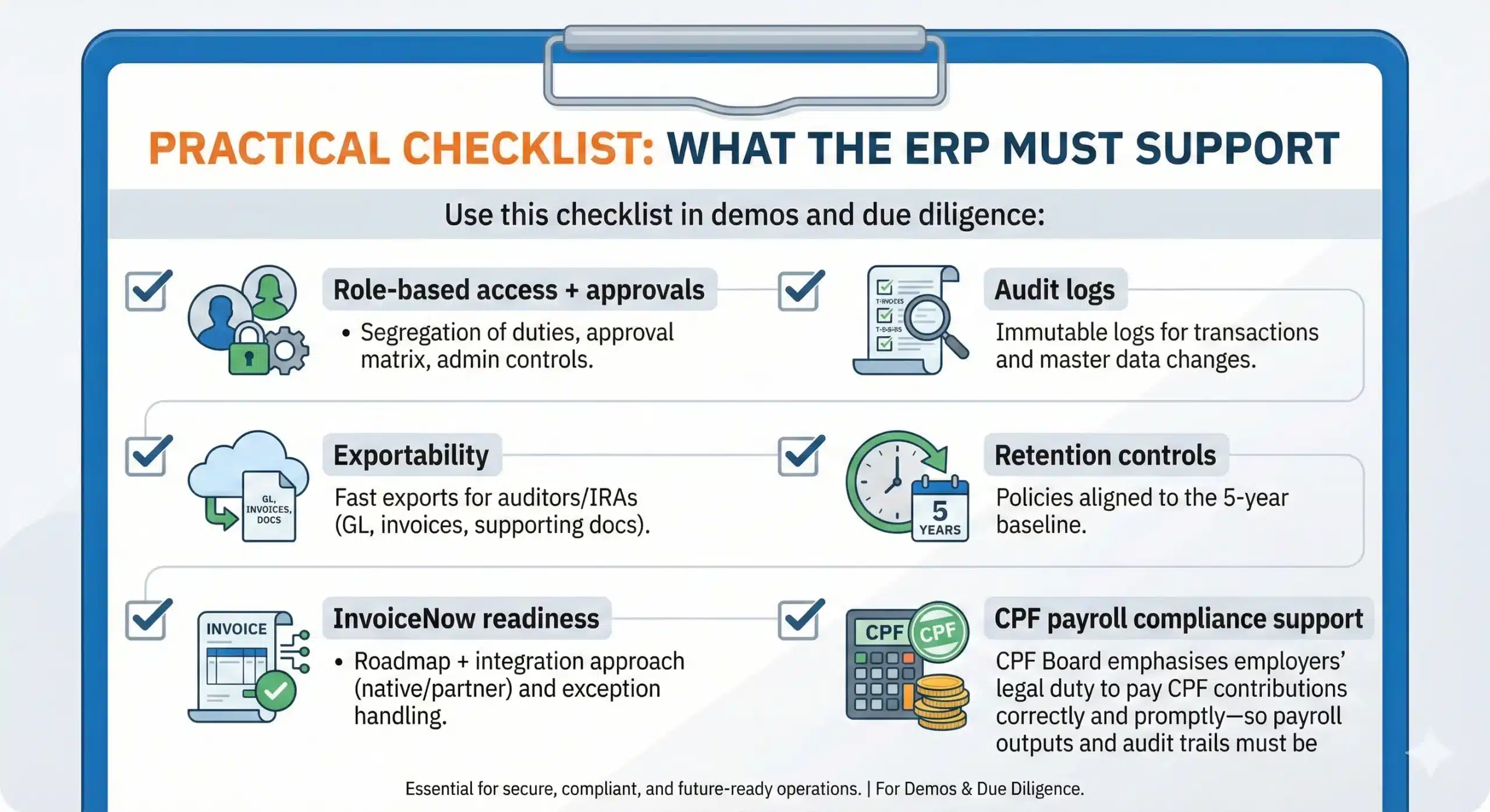 Before comparing Cloud ERP options, it helps to align on Singapore’s non-negotiables, PDPA governance, IRAS/GST record-keeping, ACRA-ready audit trails, and CPF payroll accuracy. The points below highlight what your ERP must support, whether you choose Cloud ERP (SaaS) or an on-premises setup.