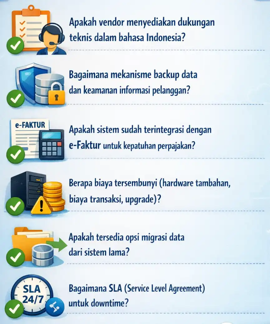 Satu hal penting yang sering terlewat: pastikan aplikasi pilihan Anda sudah comply dengan regulasi Indonesia. Mulai dari integrasi e-Faktur, standar keamanan data, hingga dukungan QRIS. Jangan sampai sistem baru justru menambah masalah di kemudian hari.