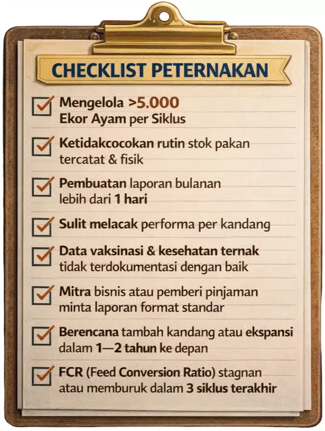 Gunakan checklist berikut untuk mengevaluasi apakah peternakan Anda sudah membutuhkan sistem manajemen digital:
