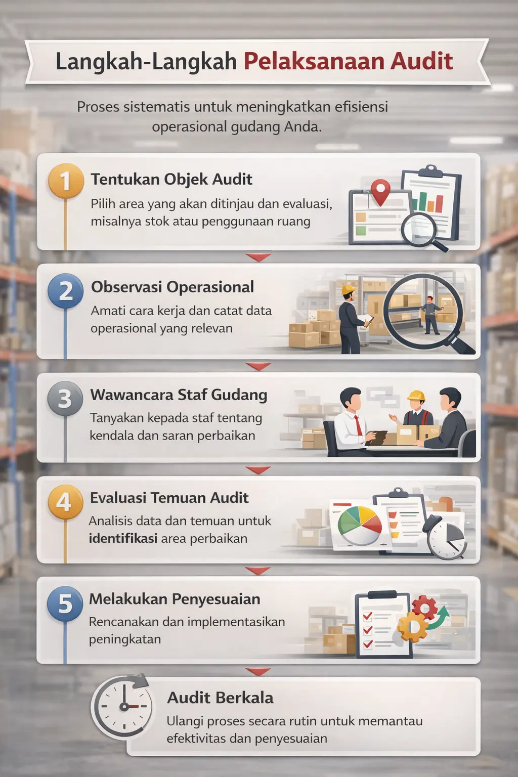 Dengan mengikuti langkah-langkah ini, perusahaan dapat melakukan audit gudang dengan sistematis dan mendapatkan hasil yang akurat untuk meningkatkan efisiensi operasional gudang.