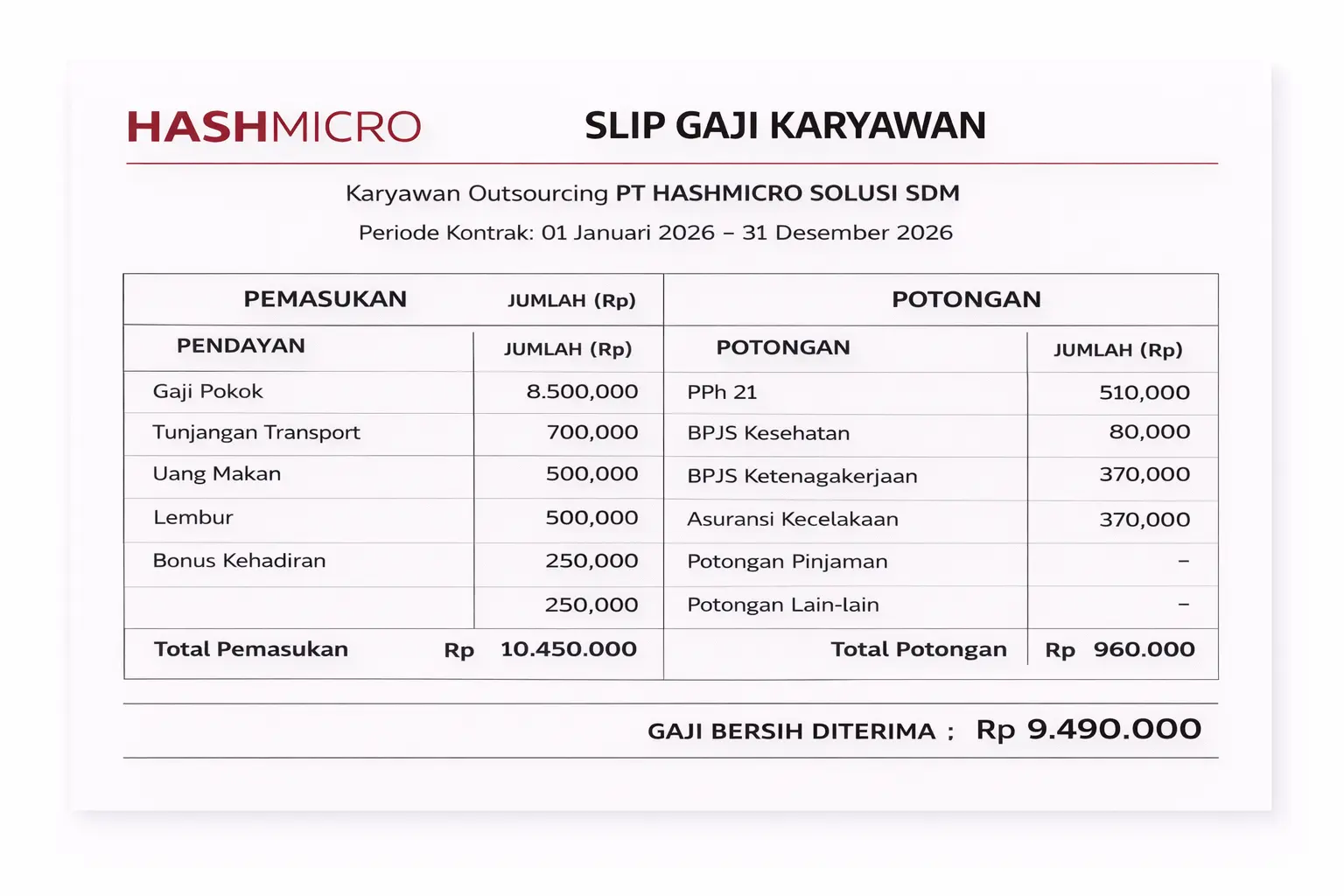 Pada sistem kerja outsourcing, slip gaji memiliki peran tambahan untuk memperjelas batas tanggung jawab antara vendor dan perusahaan pengguna jasa. Karyawan jadi tahu komponen apa saja yang dibayarkan vendor, potongan apa yang diterapkan, serta bagaimana nominal akhir terbentuk. Di sisi lain, perusahaan penyedia jasa juga lebih mudah menjaga transparansi terhadap tenaga kerja yang ditempatkan di banyak klien berbeda.