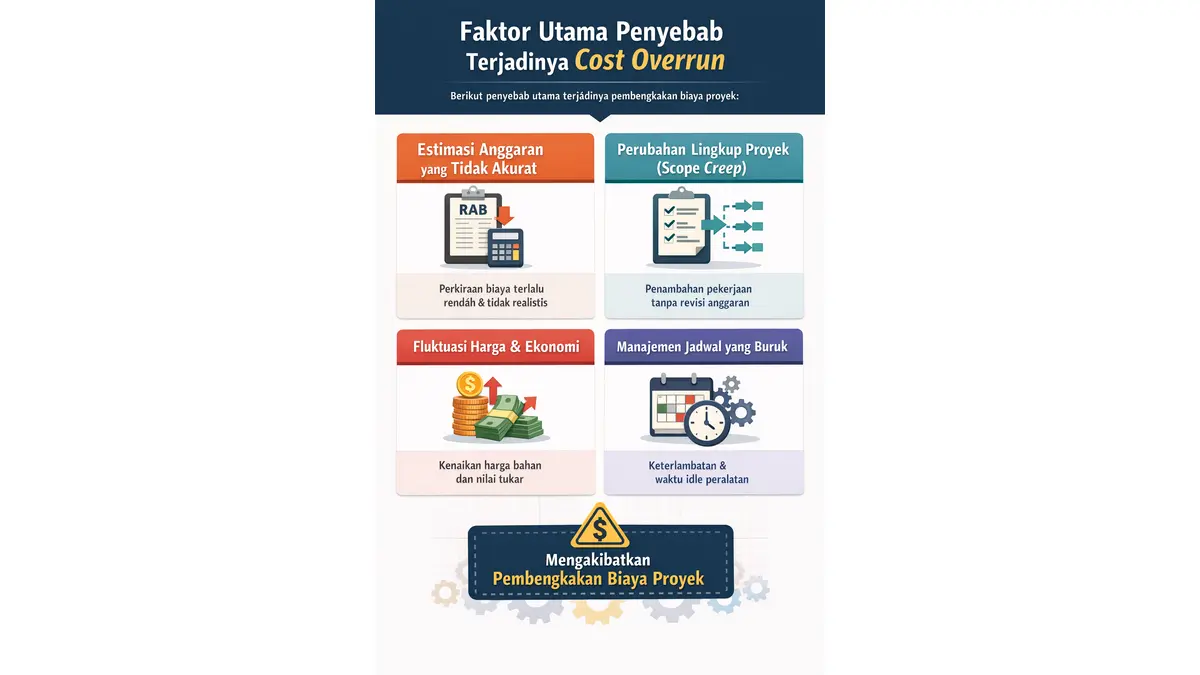 Cost overrun adalah kondisi di mana biaya aktual pelaksanaan proyek melebihi anggaran yang telah direncanakan (budgeted cost), yang secara langsung menurunkan margin keuntungan perusahaan.