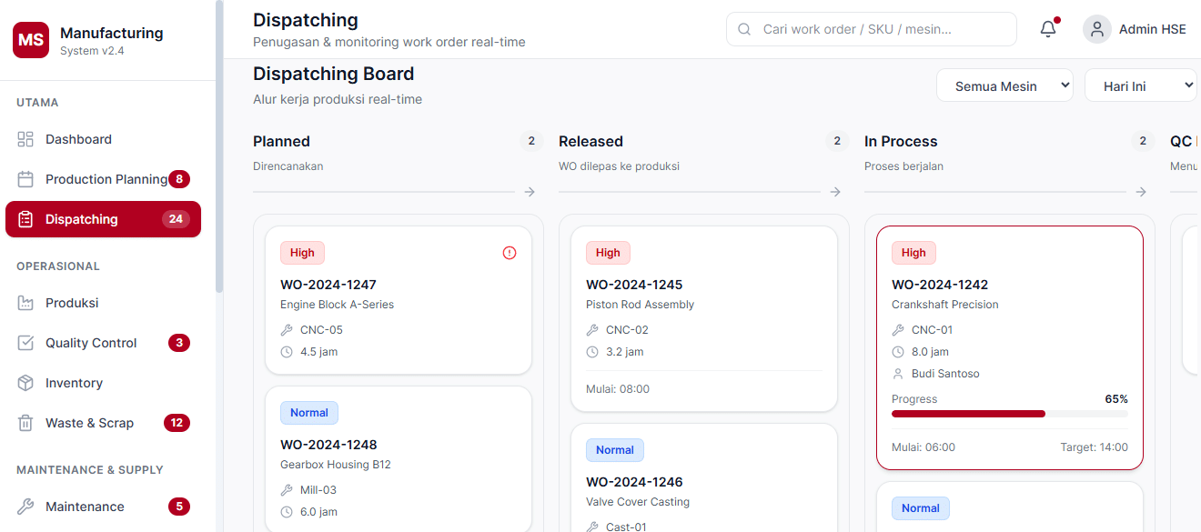 Ketika dispatching dijalankan dengan dukungan sistem, alurnya menjadi lebih terstruktur. Work order dilepas ke produksi berdasarkan jadwal, kapasitas mesin, dan ketersediaan material, lalu statusnya diperbarui secara berkala oleh operator atau supervisor.