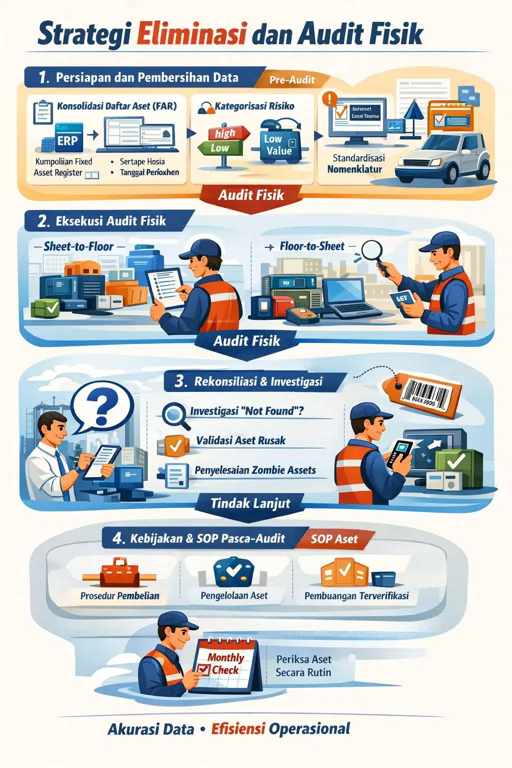 - Penyelesaian Zombie Assets: Untuk aset yang ditemukan tapi tidak ada di daftar, telusuri bukti pembelian atau sejarah perolehannya untuk dimasukkan kembali ke dalam buku (reinstatement).