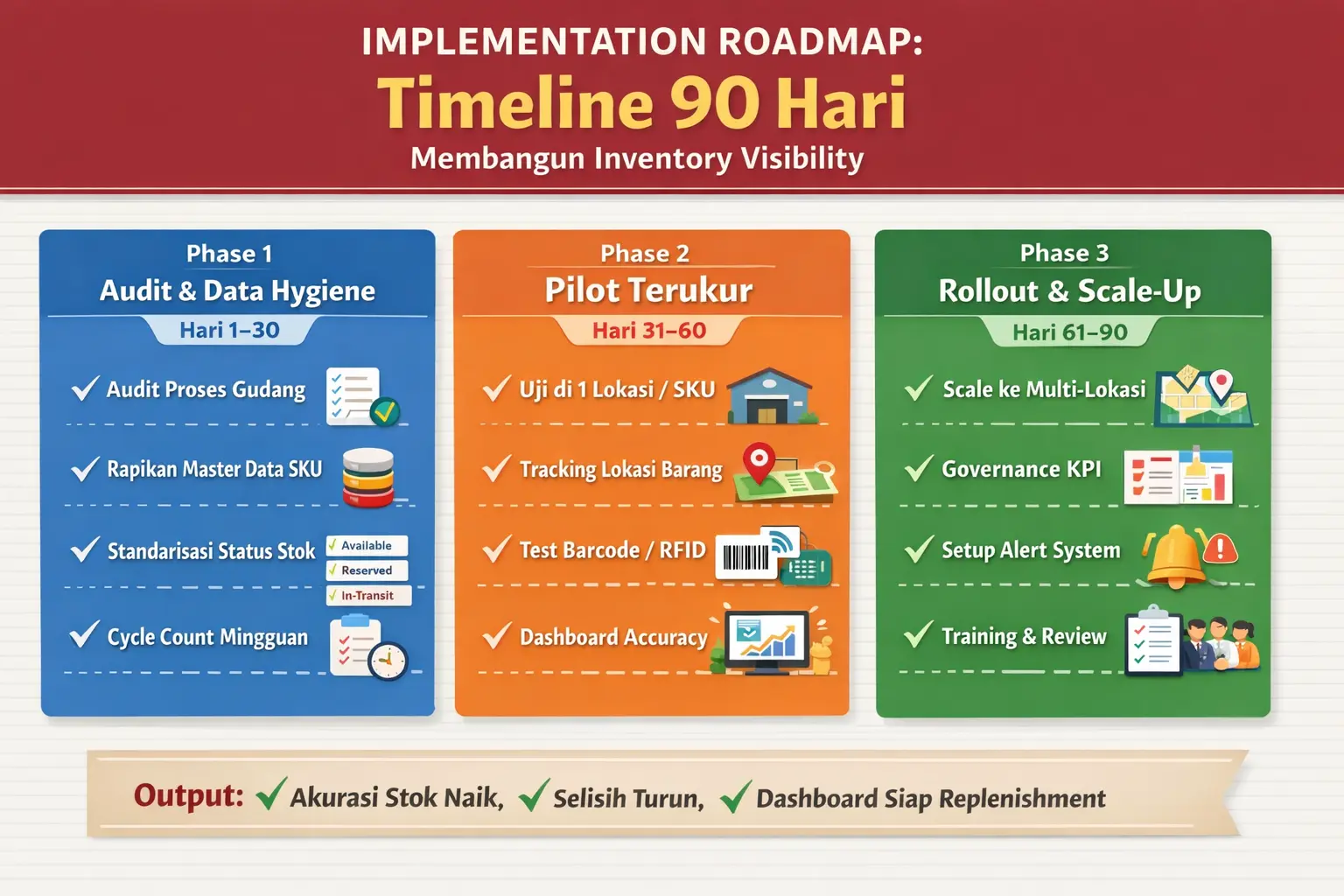 Inventory visibility tidak perlu dimulai dari proyek besar. Pendekatan paling aman adalah membangun fondasi data dan proses terlebih dulu, lalu menjalankan pilot terukur sebelum rollout. Roadmap 90 hari di bawah ini dapat dipakai sebagai kerangka implementasi untuk gudang tunggal maupun multi-lokasi.