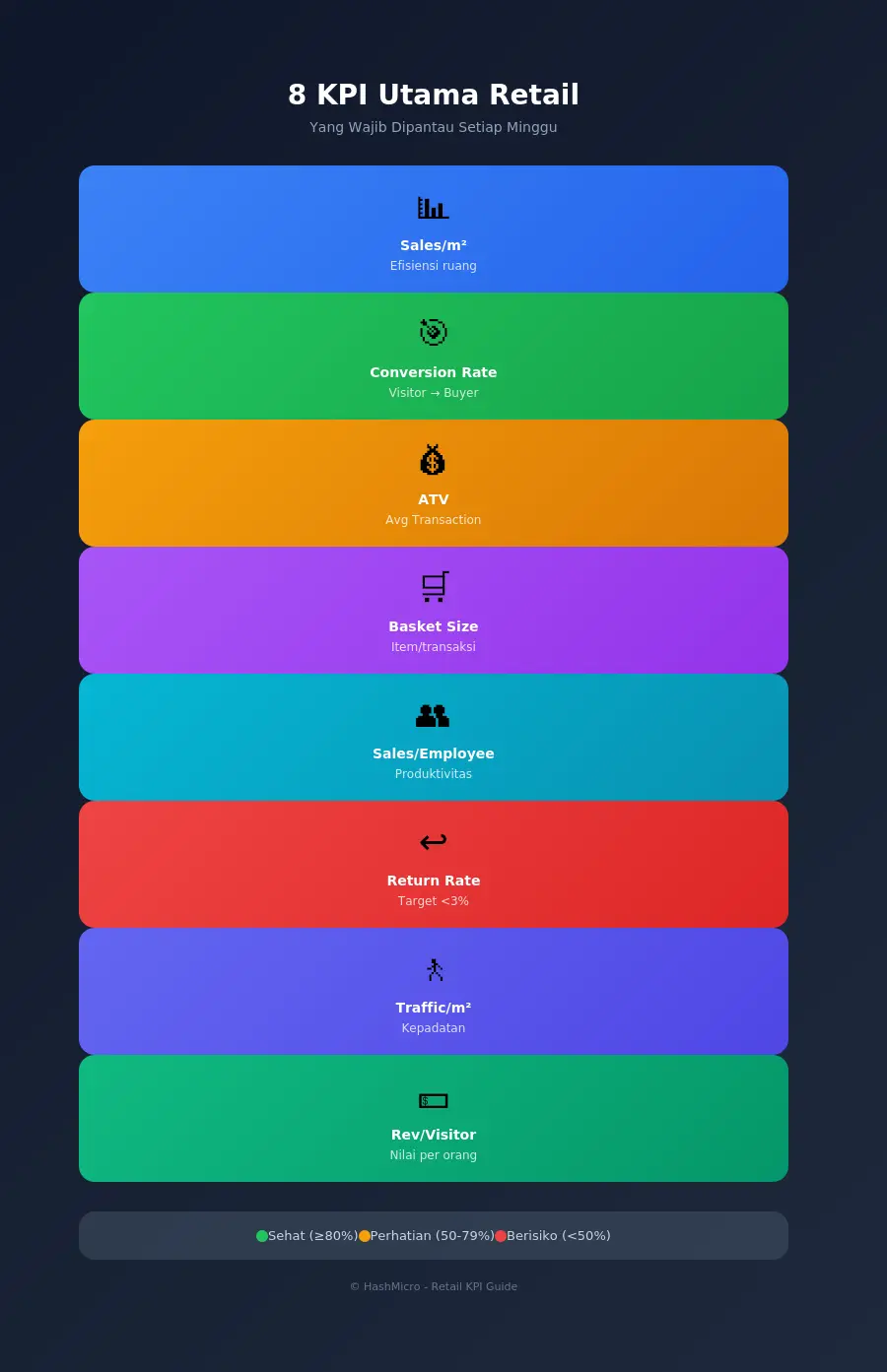 • KPI retail adalah indikator utama untuk mengukur kesehatan bisnis, efektivitas operasional, dan arah pertumbuhan toko.
