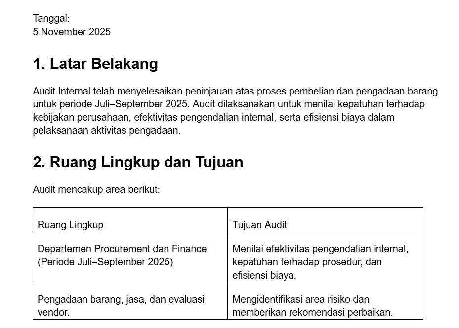 - Slide Deck: digunakan untuk presentasi hasil audit kepada manajemen atau komite audit, mencakup ruang lingkup, temuan, dampak finansial, dan prioritas tindakan.