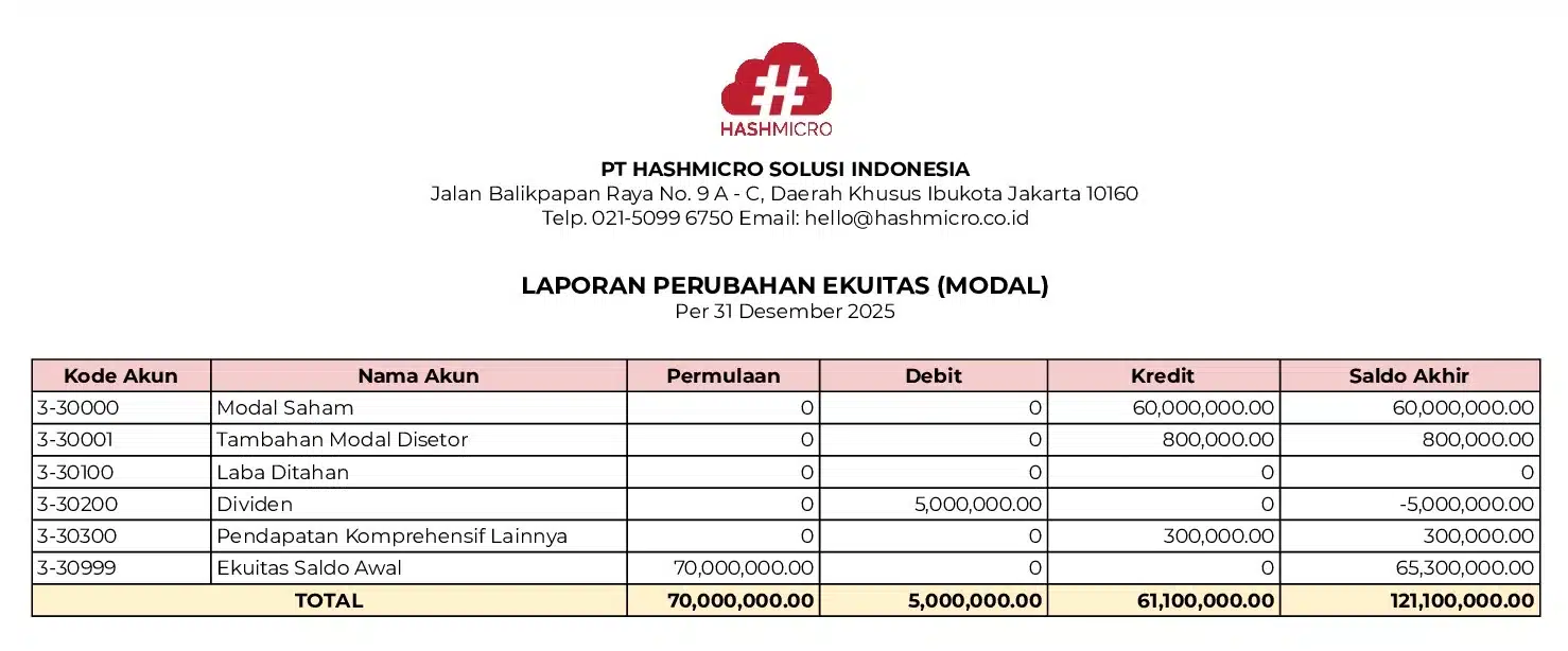 Laporan perubahan ekuitas mencatat pergerakan modal perusahaan dalam satu periode akuntansi, mulai dari modal awal, laba atau rugi yang diperoleh, hingga pengambilan dana oleh pemilik. Dari laporan ini, perusahaan dapat mengetahui seberapa besar perubahan modal yang terjadi.