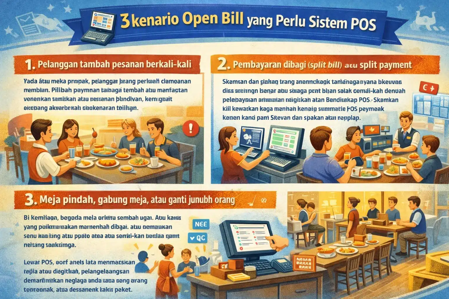 Akan lebih efektif bagi manajemen dan pelanggan jika menggunakan open bill, karena dari sistem POS cukup mengganti meja dan menambah order sebelum finalisasi.