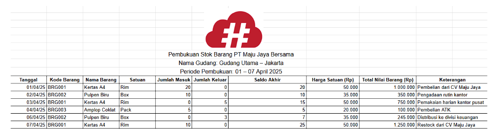 Berikut adalah contoh pembukuan stok barang laporan yang bisa Anda jadikan referensi. Di bawah ini kami juga menyediakan template gratis yang bisa Anda unduh: