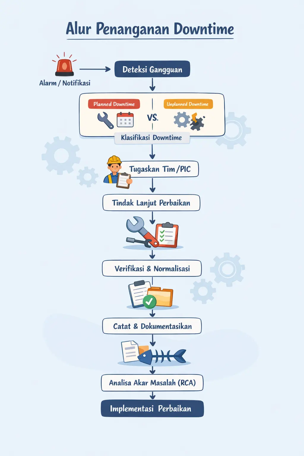 Pengelolaan downtime yang baik bertumpu pada respons yang cepat, pencatatan yang rapi, dan evaluasi penyebab yang konsisten. Dengan cara ini, tim bisa memprioritaskan perbaikan, menekan kejadian berulang, serta menjaga jadwal produksi tetap realistis.