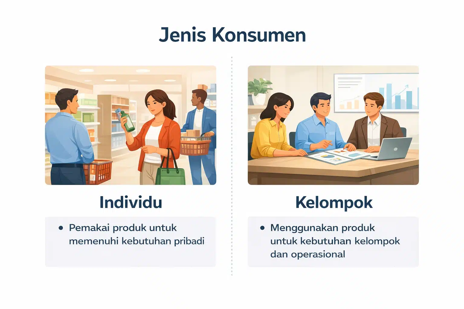 Yang pertama adalah individu, yang memakai produk untuk memenuhi kebutuhan pribadi. Yang kedua adalah kelompok, yang menggunakan produk untuk memenuhi kebutuhan kelompok dan operasional kelompok tersebut.