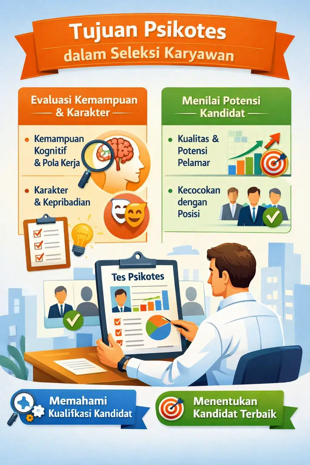 Bagi perusahaan, psikotes membantu menyaring kandidat secara lebih terstruktur sebelum masuk ke tahap seleksi lanjutan. Hasil tes dapat memberikan insight mengenai potensi kerja, cara kandidat merespons tekanan, hingga gaya kerja yang mungkin muncul di lingkungan tim. Informasi ini penting untuk memastikan bahwa kandidat tidak hanya kompeten secara teknis, tetapi juga selaras dengan kebutuhan organisasi.
